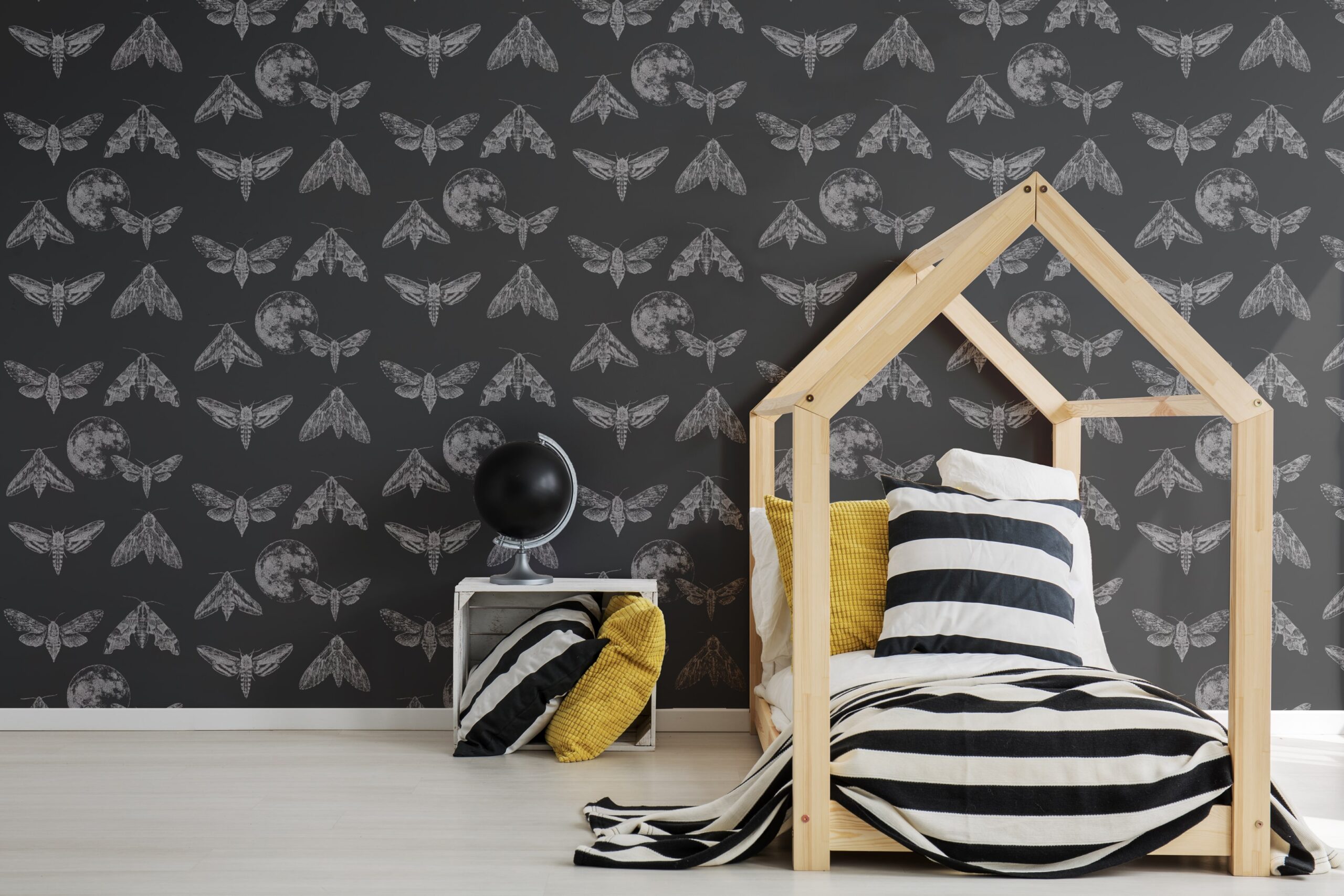 This wallpaper is an excellent choice for adding a touch of elegance and drama to your interior design. The black background serves as an ideal canvas for the white moths, creating a bold and striking contrast. This combination can create a sense of depth and dimension, making it perfect for creating a statement wall or for adding an element of interest to any room.